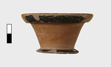 | Description: | About half rim missing. Spreading foot. Red inside lip. | |