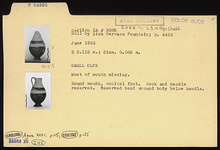 | Description: | Most of mouth missing; restored in plaster. Round mouth, conical foot. Neck and handle reserved. Reserved band around body below handle. | |