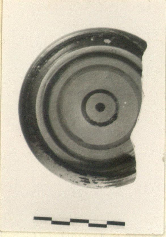 | Description: | Some of rim and body missing. Round rim. Flat bottom inset from rim. Concentric circles on top, one of them red. Underside reserved. | |