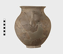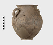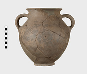 ADDENDA P 25004: Wide mouth; deep rounded body; low ring foot; rolled handles on shoulder with deep thumbprints at base. Grayish-brown cooking ware. Unglazed.