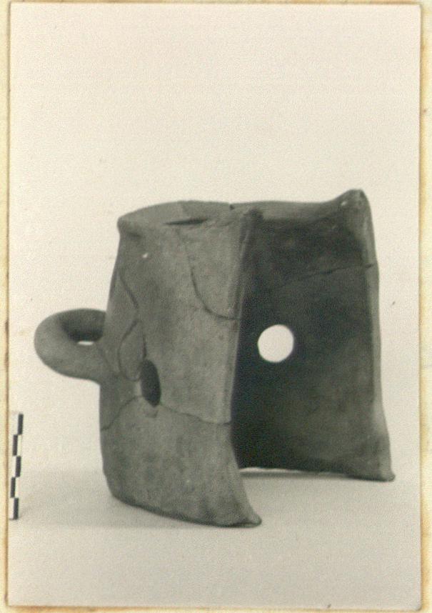 Description:   Fragments missing. Horseshoe-shaped. Single handle. Two round holes in side. Rising spurs at open end of rim.