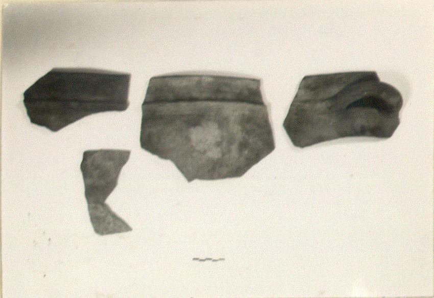 | Description: | One handle and some of rim and body preserved; two non-joining fragments. Plain rim with raised band below it at level of rolled horizontal handle. Deep pot of cooking ware fabric; blackened inside. | |