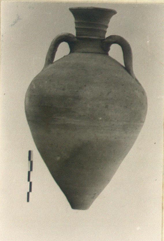 | Description: | Intact. Flaring lip; body tapers to blunt point. Drab-brown clay with fine gold mica. Import. | |