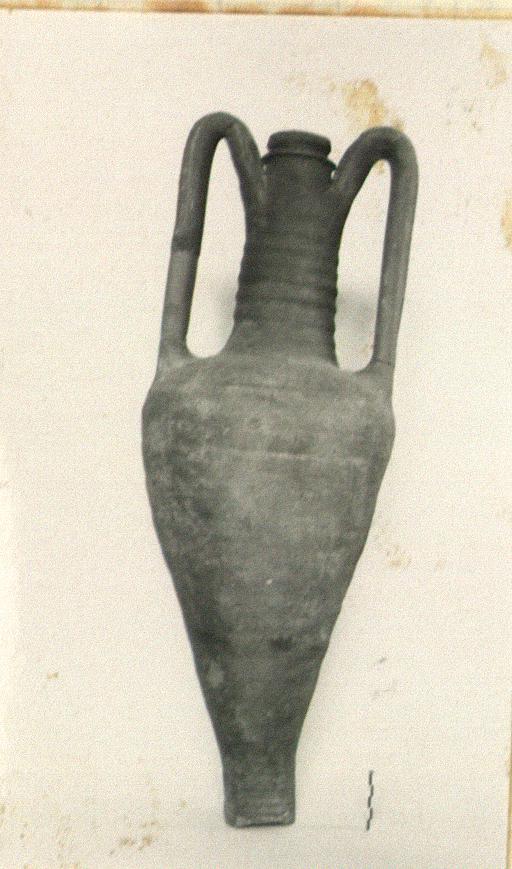 | Description: | Part of one handle missing; foot rather worn. Tall neck and handles. Unglazed. Another almost identical, container 98, in uncatalogued pot storage. | |
