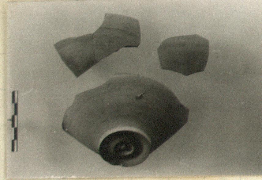 | Description: | Lower part of pot preserved, in a single piece (fr. a, container 128); also loose fragment (two joining sherds) of upper body of same(?) (fr. b, container 150) and single sherd of belly (fr. c, container 135). Low triangular foot, spike under center (hollow) within a deep cavity; round body. Slight ribbing on body. Egg-shell fabric. Light brownish ware, light yellow on outside, with light gray tint at core. Remains of a red wash on fr. b). Import; source uncertain [JWH]. | |
