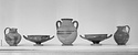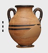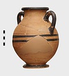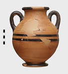 | Description: | Fragments of body and piece of mouth missing; restored. Rolled rim and rising handles; spreading foot. Body reserved with thin glaze wash. Black glaze for mouth and inside neck, handles, foot, and a pair of lines around middle of body; above and below these lines a narrow red line. | |