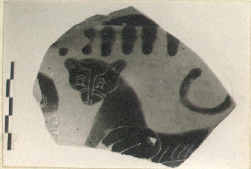 | Description: | Fragment from upper wall of a large krater. Head and part of body of a panther to left. In front of it part of head of a siren(?) averted. Above, tongues, then part of neck of vase. Inside, dilute glaze below, good black above. Traces of added red on ribs, nose. | |
