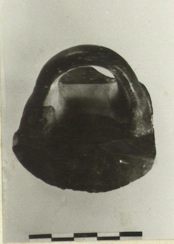 | Description: | Handle fragment with part of wall. Outside glazed, except handle space and inside of handle and reserved line below rim. Inside, broad glazed and reserved bands alternating; thin brown lines in the reserved bands. Dull black glaze. Cf. Kerameikos V, 1, pl. 129, no. 787. | |