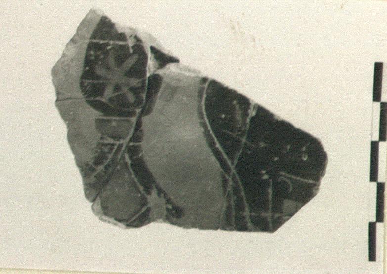 | Description: | Mended from 5 pieces. Breast and upper front legs of feline, left. Lotus-palmette ornament, on the bud a star in red. Inside unglazed. | |