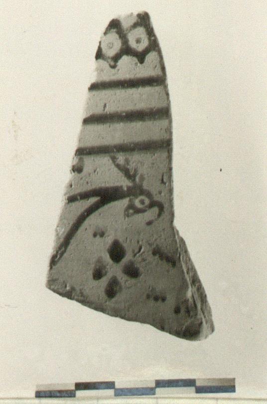 | Description: | Wall fragment from a large pot with thick walls. Above, dotted diamond pattern; bands. Head of cock in outline. Diamonds and zigzags in field. Brown glaze; clay pinkish-buff. | |