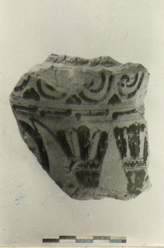 | Description: | Top of piece preserves rounded attachment beneath bowl. On bowl attachment, zone of spirals and triangles. Below, running dog pattern enclosed by several lines. Below, lotus flowers with black and white petals. Centers have added red. Broad black curved band at left of lotus. Dull black glaze. Clay porous pink-buff. | |