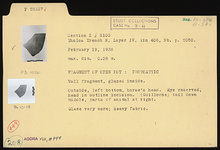 | Description: | Wall fragment, glazed inside. Outside, left bottom, horse's head. Eye reserved, head in outline incision. (Guilloche) tail down middle, parts of animal at right. Glaze very worn; heavy fabric. | |