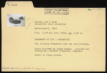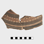 | Description: | Two joining fragments and one non-joining. Zones divided by three bands. Outside in: triangles, hatched diamonds, zigzags. Brown to black glaze. | |