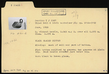 | Description: | Much of wall and part of bottom missing. Flat bottom outlined by groove; two grooves at plain lip; band handle attached just below lip. Worn black to brown glaze. | |