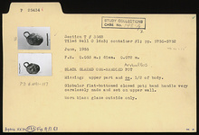 | Description: | Upper part and ca. half of body missing. Globular flat-bottomed closed pot; band handle very carelessly made and set on upper wall. Worn black glaze outside only. | |
