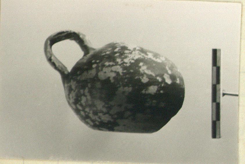 | Description: | Upper part and ca. half of body missing. Globular flat-bottomed closed pot; band handle very carelessly made and set on upper wall. Worn black glaze outside only. | |