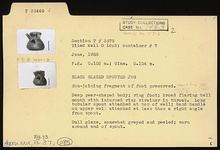 | Description: | Non-joining fragment of foot preserved. Ring foot; deep pear-shaped body; broad flaring bell mouth with inturned rim; strainer in throat; long tubular spout attached at top of wall; band handle on upper wall attached at less than a right angle from spout. Dull glaze, somewhat grayed and peeled; worn around end of spout. | |