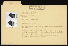 | Description: | Wall fragment from bell krater, handle attachment at left. Torso and lower part of head of bearded satyr, to right, carrying lyre. Egg pattern around handle. Good glaze inside; partial relief contour. Micaceous pinkish-buff clay. | |