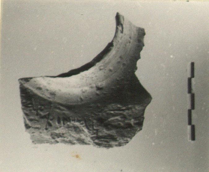 | Description: | Fragment of neck and shoulder of large storage jar. Letters heavily incised on shoulder before firing, broken to right: <graphic> Hard, gritty red clay, chipped on exterior. | |