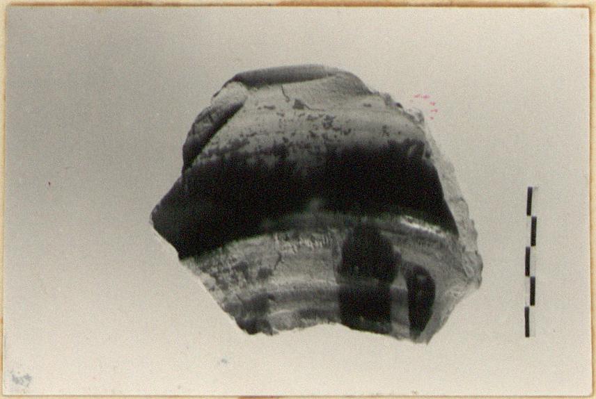 Description:   Profile of rim and incurve just below preserved. Rim reserved above, traces of red. Outside, crude blotches of glaze below rim and traces of attachment of handle.