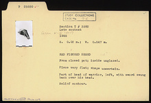| Description: | From closed pot; inside unglazed. Piece very flat; shape uncertain. Part of head of warrior, left, with sword swung back over his head. Relief contour. | |