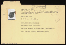 | Description: | Fragment from lower wall. Overall pattern of close-set fleur-de-lis. Clay burned gray, glaze dull brown. | |
