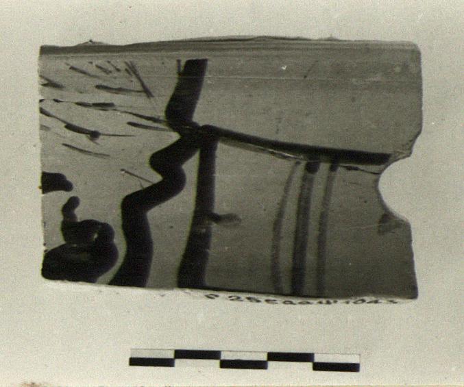 | Description: | Fragment from upper wall towards rim. Part of cloaked figure, very coarsely rendered, and some lines behind him. Probably from a pot spoiled before finishing, since the boy's head is drawn very high up and the lower edge is in part cut. Lifting hole, unglazed, at left. | |