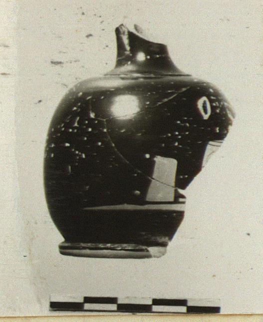 | Description: | Three joining fragments preserve part of neck, wall and bottom of a squat lekythos. Of the scene there remains part of the figure of a cloaked youth right, seated(?). In front of him, a goal post; in the field a wreath. Good glaze, slightly pitted. Underside unglazed. | |