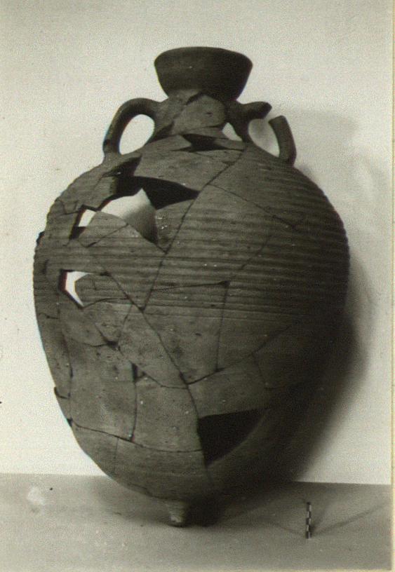 | Description: | Ovoid wheel ridged amphora mended from many fragments. Missing parts of wall, neck, and part of one handle. Short conical neck, deep everted rim. Clay buff with white particles. | |