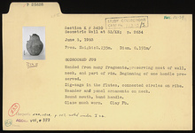 | Description: | Mended from many fragments, preserving most of wall, neck, and part of rim of godrooned jug. Beginning of one handle preserved. Zigzags in the flutes, connected circles on ribs. Maeander and panel ornaments on neck. Round mouth, band handle. Glaze much worn. Clay pinkish-buff. | |