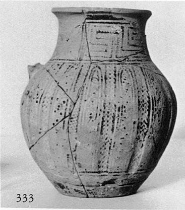 | Description: | Mended from many fragments, preserving most of wall, neck, and part of rim of godrooned jug. Beginning of one handle preserved. Zigzags in the flutes, connected circles on ribs. Maeander and panel ornaments on neck. Round mouth, band handle. Glaze much worn. Clay pinkish-buff. | |