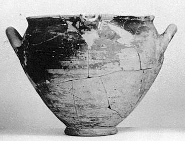 | Description: | Part of rim and fragments of wall restored. Wall tapers sharply to high ring foot; rolled handles on shoulder. Glazed solid. Worn brown to red glaze. | |