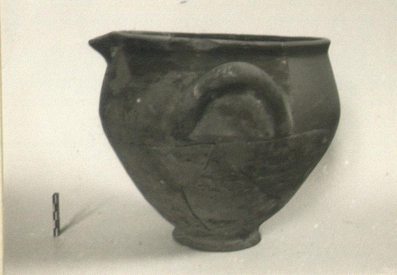 | Description: | Part of rim and fragments of wall restored. Wall tapers sharply to high ring foot; rolled handles on shoulder. Glazed solid. Worn brown to red glaze. | |