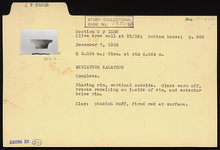 | Description: | Complete. Glaze worn off, traces remaining on inside of rim, and exterior below rim. Flaring rim, vertical outside. Clay pinkish-buff, fired red at surface. | |