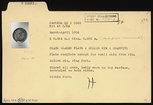 | Description: | Plate complete except for small chip from rim. Rolled rim, ring foot. Within foot: <graphic> Glazed over all, badly worn on top surface, scratched on both sides. | |
