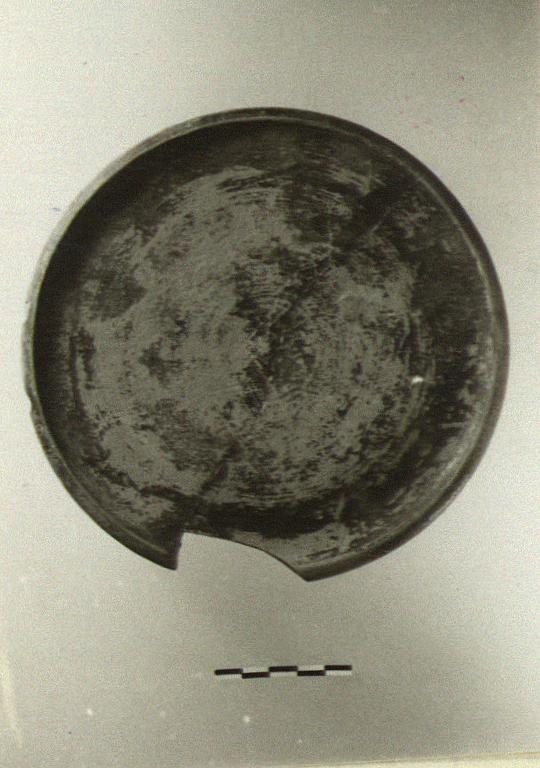 | Description: | Plate complete except for small chip from rim. Rolled rim, ring foot. Within foot: <graphic> Glazed over all, badly worn on top surface, scratched on both sides. | |