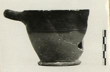 | Description: | One handle and some of rim missing. Pinkish-buff clay. Glaze mottled black to red. Bottom reserved and strongly reddened; dot and circle. | |