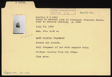 | Description: | Broken all around. Wall fragment of pot with angular body. Stripes running from the ridge. Gray clay. Matte-Painted Decoration. | |