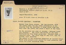 | Description: | Mended from three pieces. The top missing with the handle save for the lower attachment; a bit missing from the shoulder as well as a large piece from the wall near the front, and about a third of the base. On the shoulder two rows of strokes, "debased lotus bud pattern". The front two-thirds of the body decorated by four large palmettes. Further down, a reserved band. The outer edge of the foot and its bottom, reserved. The petals of the palmettes separated by incised lines. White dots around a red center for each palmette and white for lines enclosing them. | |