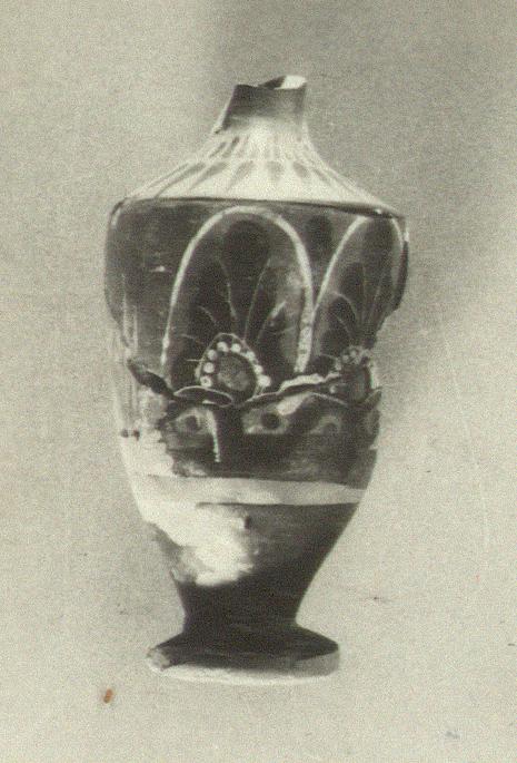 | Description: | Mended from three pieces. The top missing with the handle save for the lower attachment; a bit missing from the shoulder as well as a large piece from the wall near the front, and about a third of the base. On the shoulder two rows of strokes, "debased lotus bud pattern". The front two-thirds of the body decorated by four large palmettes. Further down, a reserved band. The outer edge of the foot and its bottom, reserved. The petals of the palmettes separated by incised lines. White dots around a red center for each palmette and white for lines enclosing them. | |
