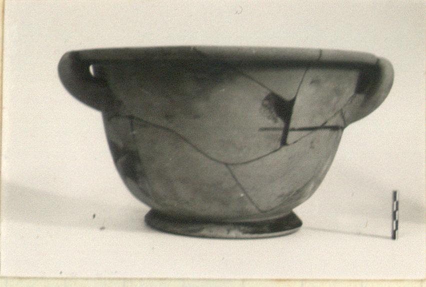 Description:   About one-fourth missing. Restored in plaster. Handle attached to rim.