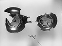 | Description: | Mended from several pieces; nearly half the rim preserved and the start of both handles. The stem entirely missing. Irregular reserved circle framing the medallion which depicts a crouching warrior, right. The medallion complete save for a small piece through the warrior's right arm and the border. The warrior, nude save for his cap and a cloak over his outstretched left arm, faces right in a crouching, or knee-running position, a spear in his right hand. At the forehead the cap has a sort of beak, or perhaps his hair is showing. Narrow eye, full face; the glaze has peeled off from the lines at the inner corner. Handle spaces not reserved. Traces of red wash. Relief contours; the inner drawing in heavy relief lines. | |