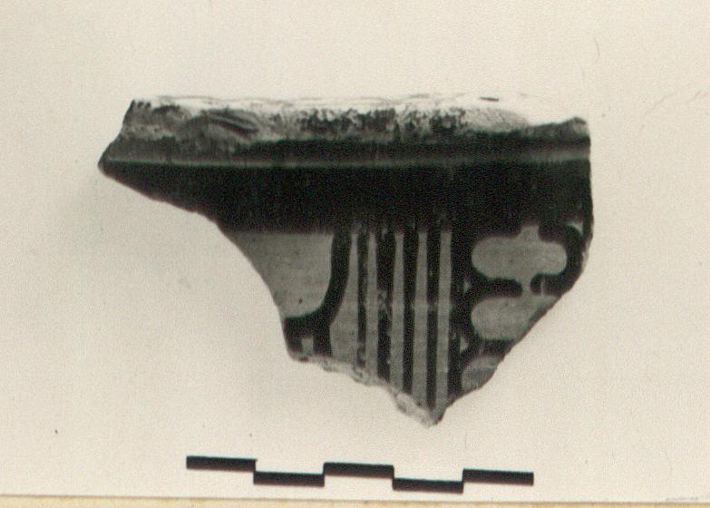 | Description: | Fragment of rim. Flat-topped projecting rim. Decoration: on top of rim, zigzag between single bands. On wall, band of verticals with designs to either side. Firm reddish-brown glaze. | |
