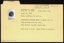 | Description: | Chips missing from one side. Flat bottom; shallow convex top. Clay gray at core, light brown at surface. | |
