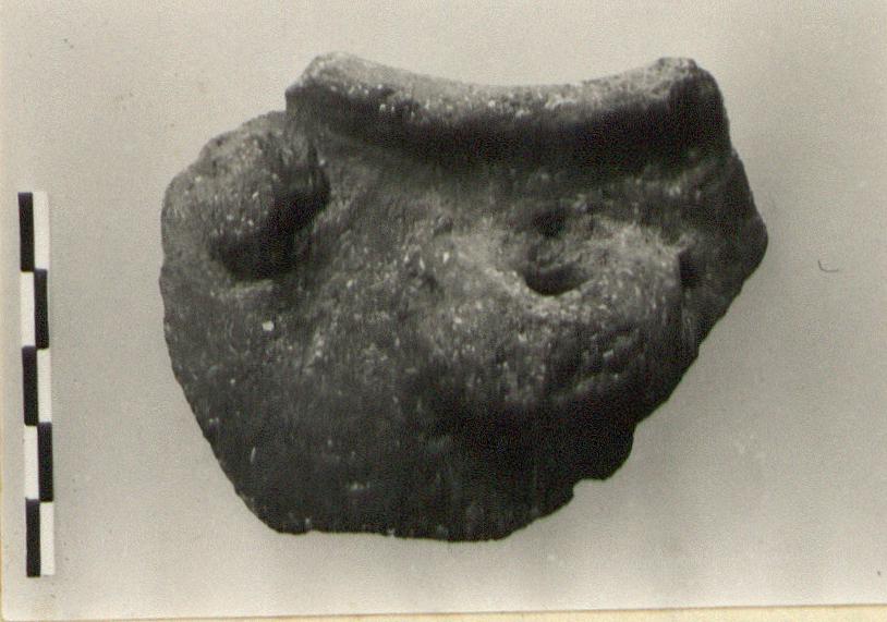 | Description: | Rim and part of wall. Plain vertical rim. Horizontal pierced handle. Pierced knob to left of handle. Gritty brown clay with white bits, gray at core. | |