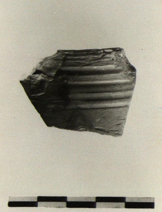 | Description: | A bit of rim and wall of a very small measure. Black glazed inside and on top of rim. Outside reserved and grooved; below rim, official seal, owl (seal chipped above), and painted delta: <graphic>. | |