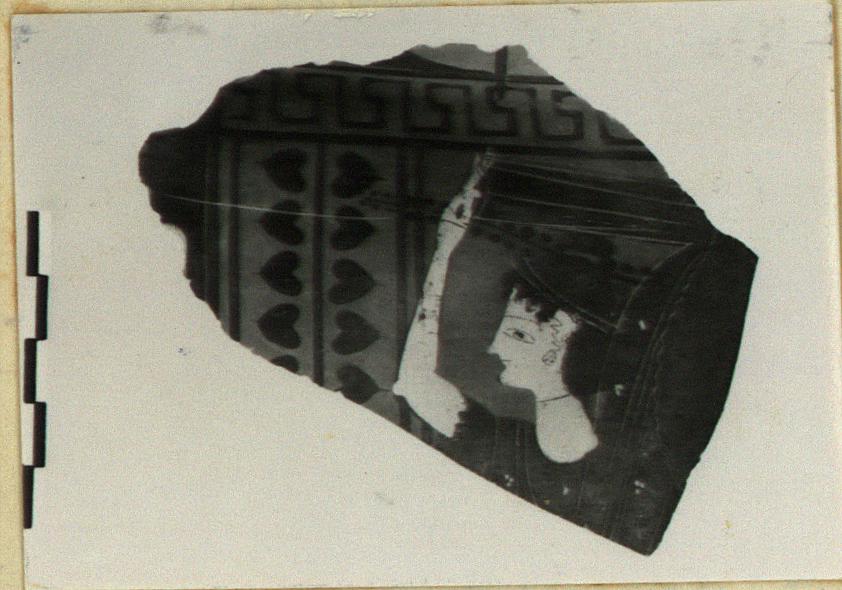 | Description: | Fragment from shoulder and wall. Above, single maeander border; at side, ivy pattern. Trace of representation on shoulder: foot, right, and a staff. In wall panel, woman (peplos, fillet, earring, bracelet) moves left, carrying a large box on her head, steadied with her right hand. Branch in field. Above and over her right shoulder, a mass of drapery. Firm white for flesh; on drapery, white triple dots and red single dots. | |