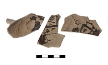Description:   One of three non-joining fragments preserves part of one of the vertical handles. Two other fragments with shallow curvature are from near the base.