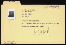 | Description: | Wall fragment from plain jar. Inscribed outside: <graphic> Micaceous pinkish-buff clay. | |
