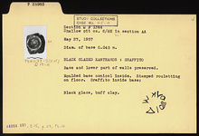 | Description: | Base and lower part of walls preserved. Moulded base, conical inside. Stamped rouletting on floor. Graffito inside base: <graphic> Buff clay. Black glaze. | |